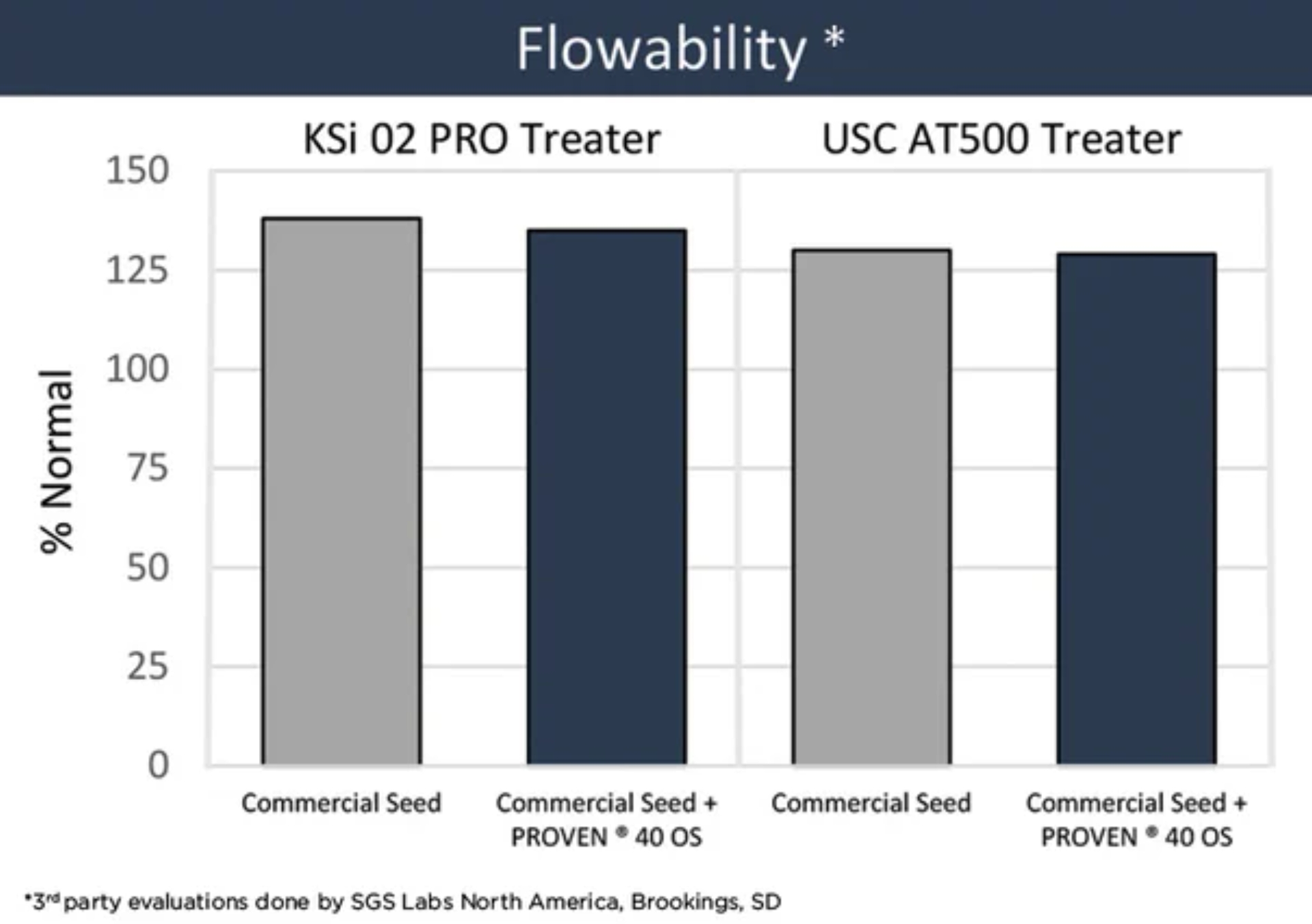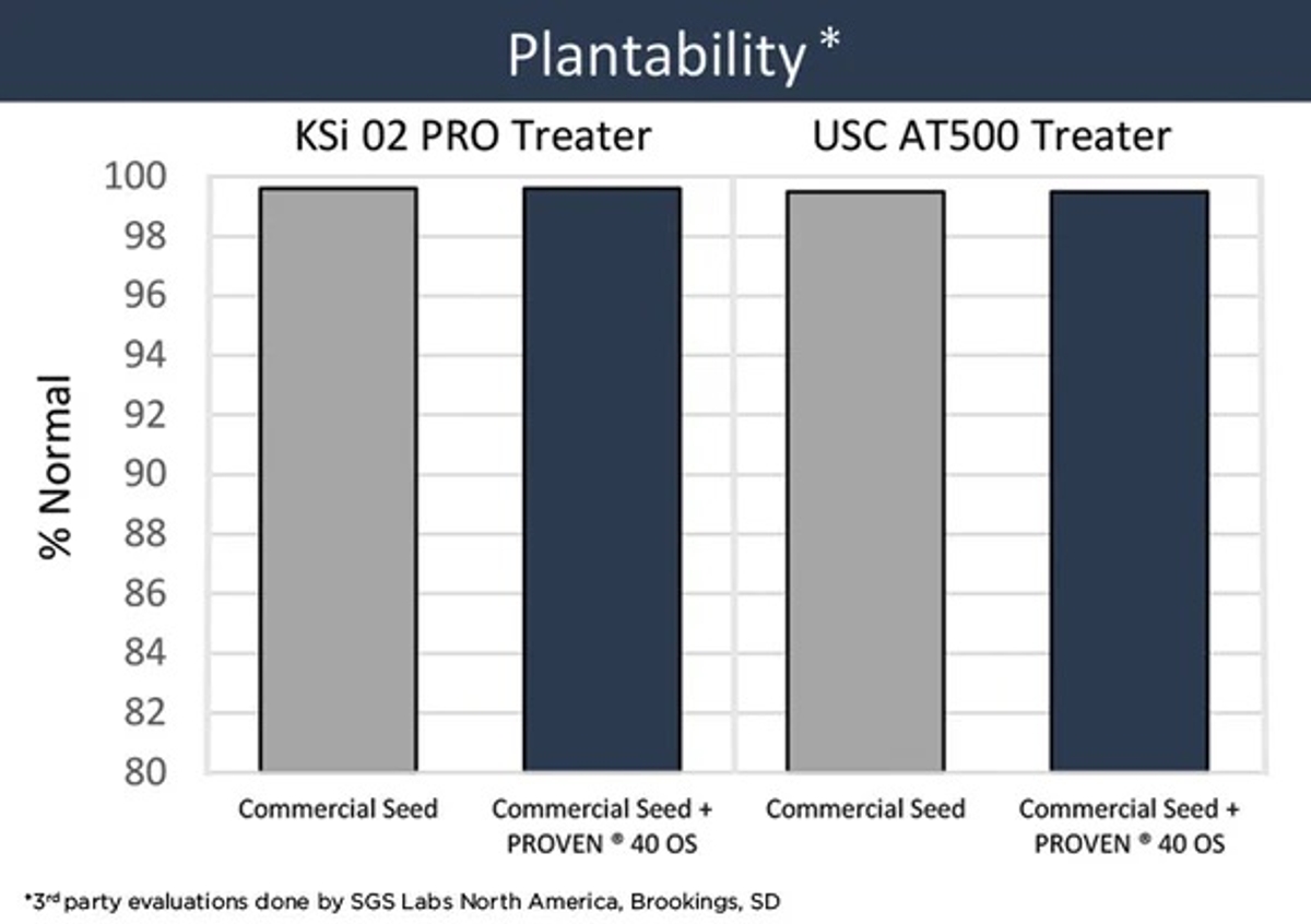 When comparing non-treated commercial seed to commercial seed treated with PROVEN® 40 OS using a KSi 02PRO SC applicator or a USC AT500H applicator, there were no differences in percent warm or cold germination (Figures 1 and 2), seed flowability (Figure 3) or seed plantability (Figure 4). Additionally, there were no differences between commercial seed applicators.